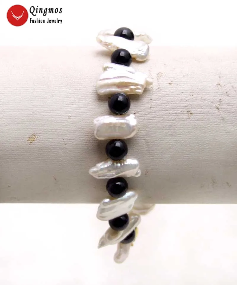Related Product for Qingmos Natural 12-15mm White Biwa Pearl Bracelets for Women with Round Black Natural Agates 7.5''