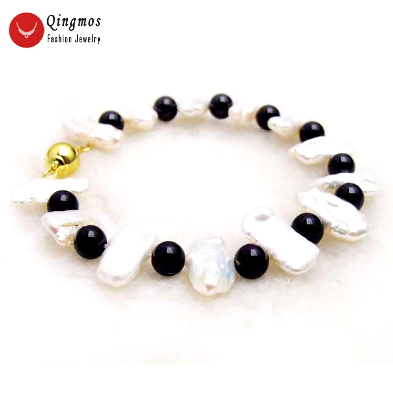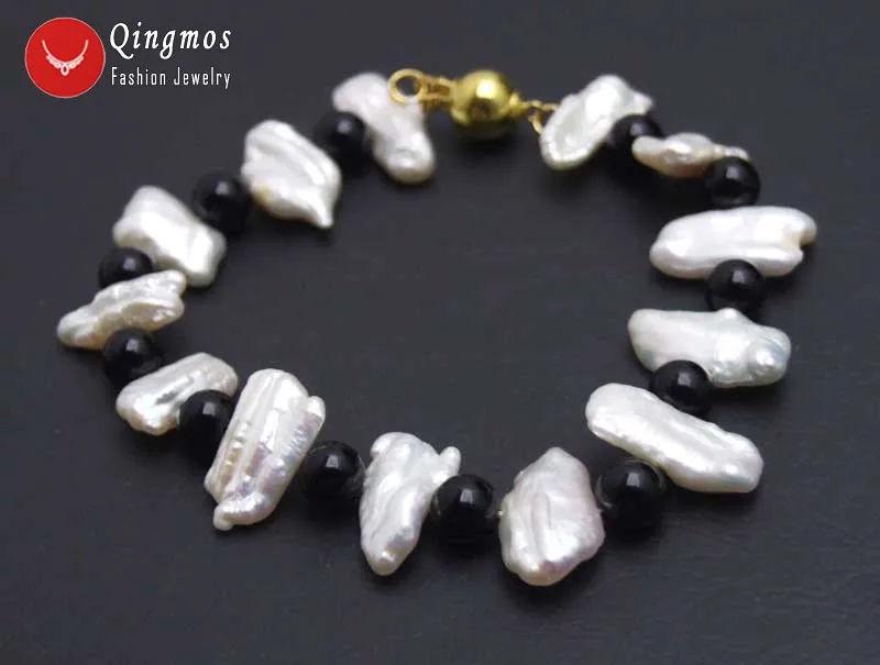 Buy Qingmos Natural 12-15mm White Biwa Pearl Bracelets for Women with Round Black Natural Agates 7.5'' Right Here and Right Now Just for USD US $9.80, Price will be rise up at any time without notification and I cant guaranted that the stock is still available tommorow or next hour. So Please Save It Now!